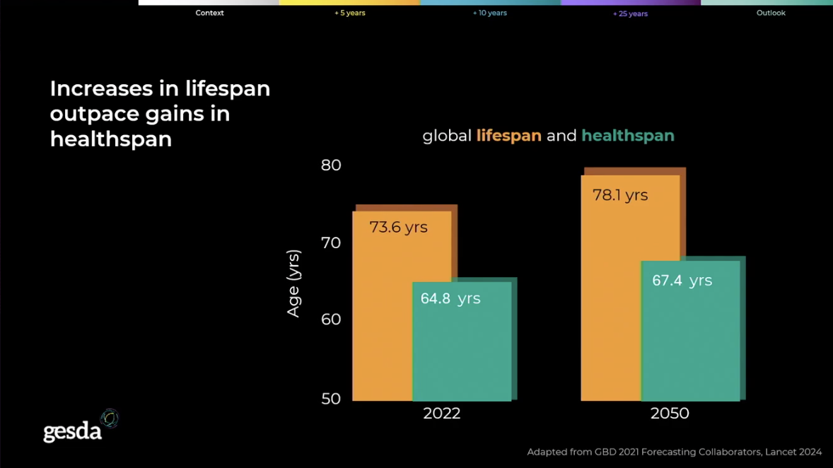 The gap is largely caused by chronic diseases such as cancers, diabetes, and cardiovascular disorders, and “the idea is that rather than targeting each of these diseases on its own, we might target aging itself,” said Wenderoth, who contributed to the Radar and GESDA Summit. “And when we slow down aging, we might also just delay the time of getting some of these chronic diseases.”